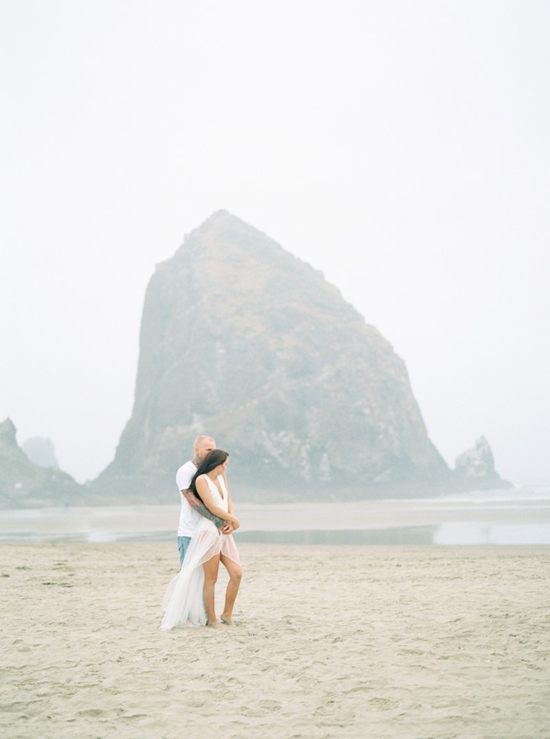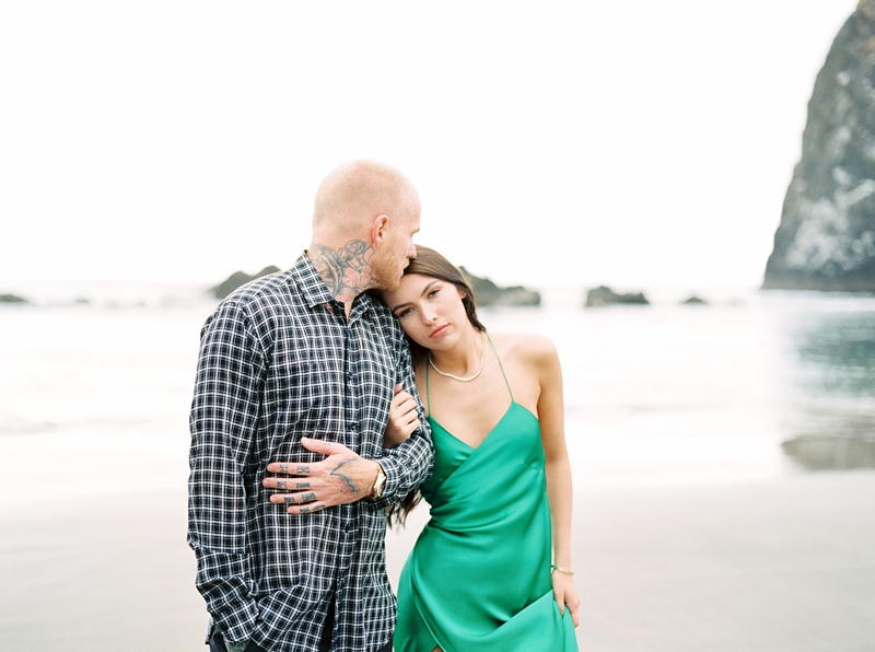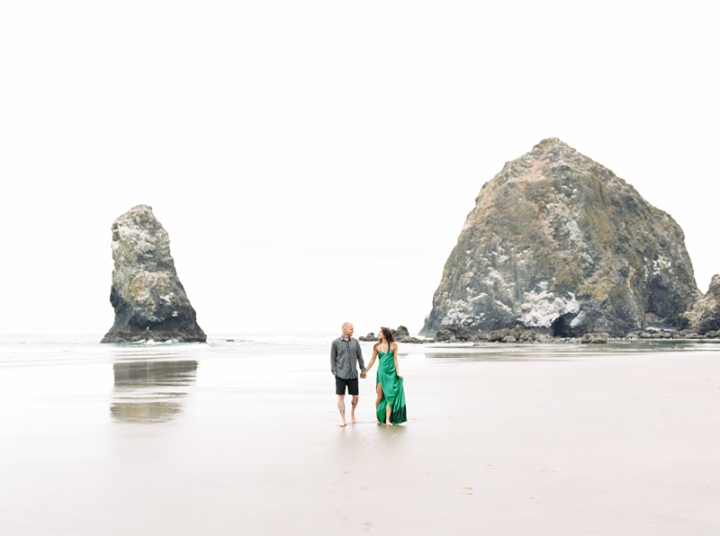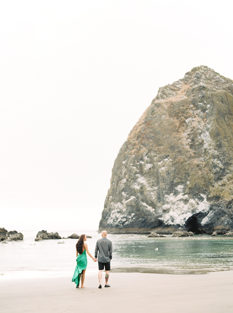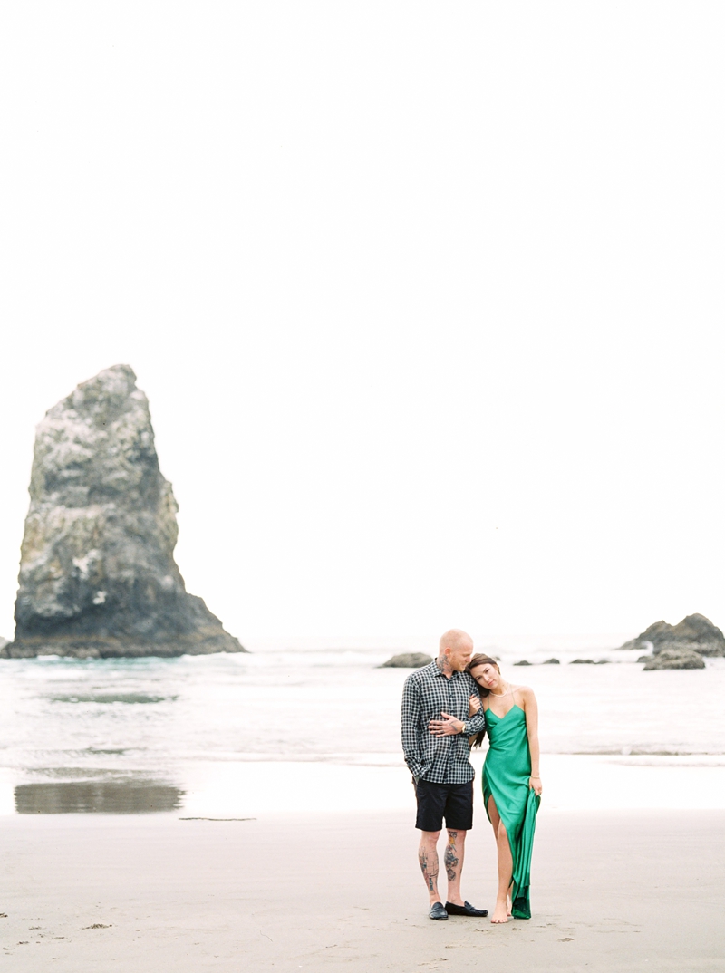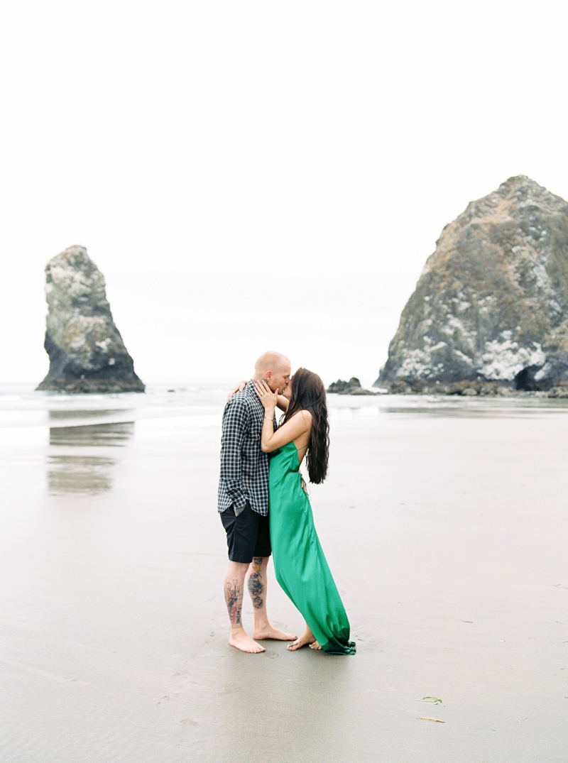 A few weeks ago I got to share Aireana and Josh’s gorgeous New Year’s Eve wedding with you at The White Sparrow Barn in Texas. Today I want to show you their stunning destination engagement photos at Cannon Beach along the picturesque Oregon Coastline. Aireana’s green dress chosen for this occasion was absolutely striking against the breathtaking scenery! The weather was cool and crisp as the fog rolled in off of the ocean and surrounded us. The couple loved how these photos showcased the magnificent beauty of the Pacific Northwest. They chose to have their engagement session photographed in Oregon because Josh owns a ranch there and they wanted to have a piece of this special place with them on their wedding day.
