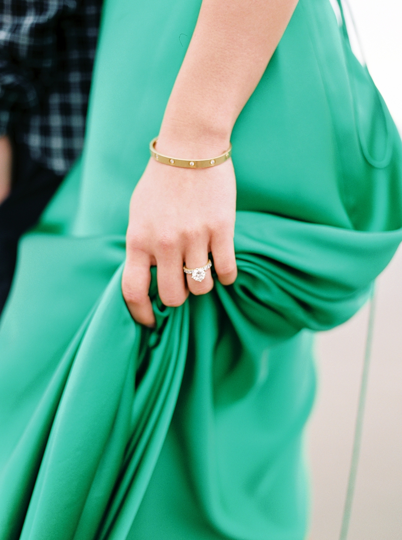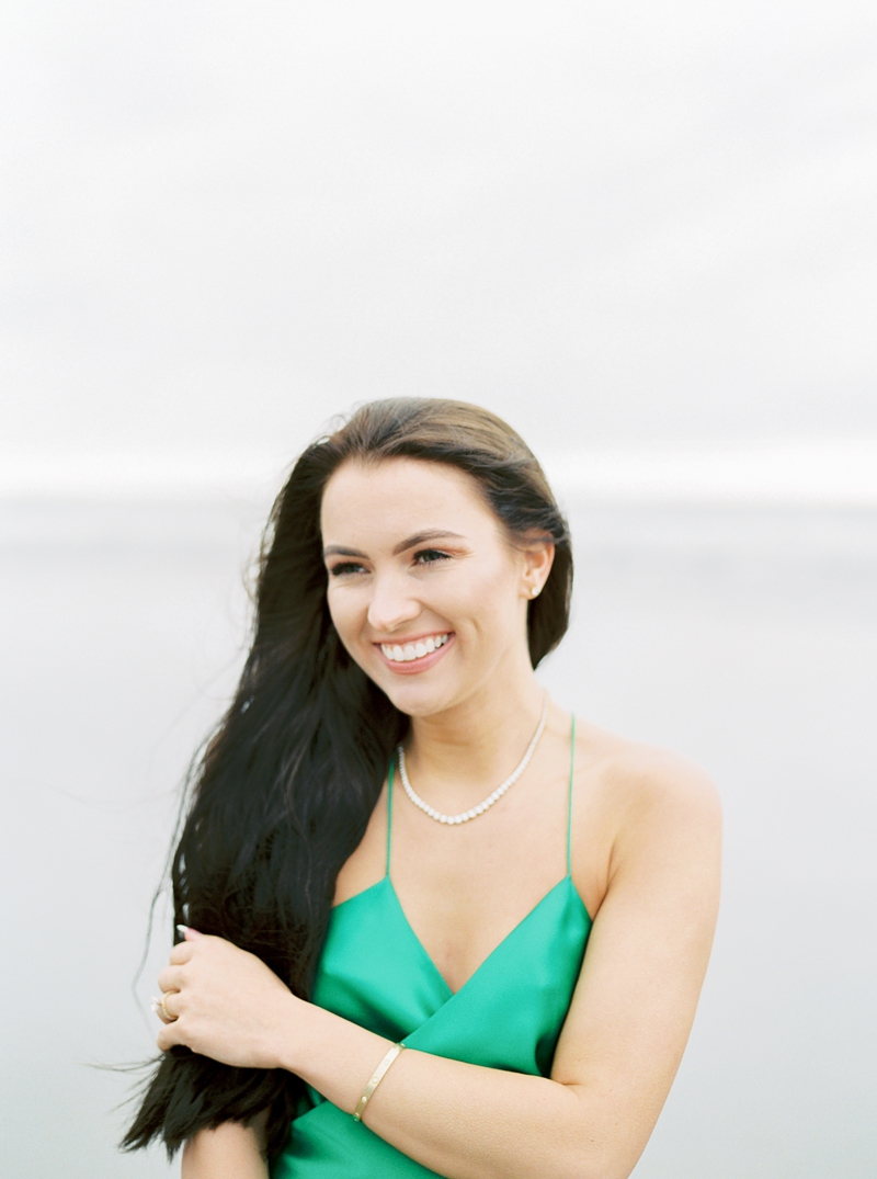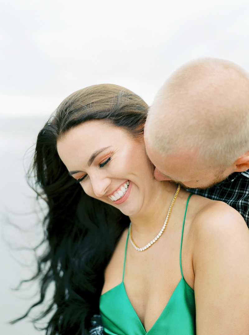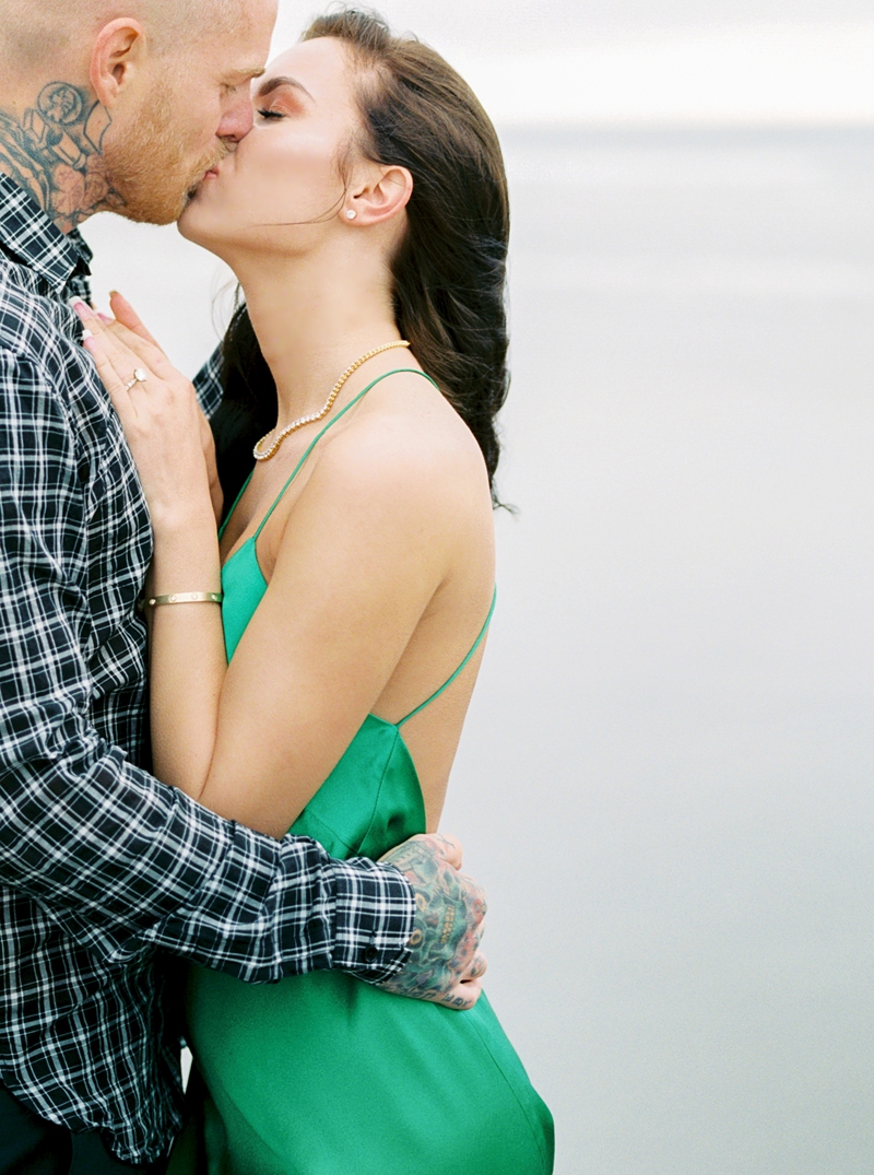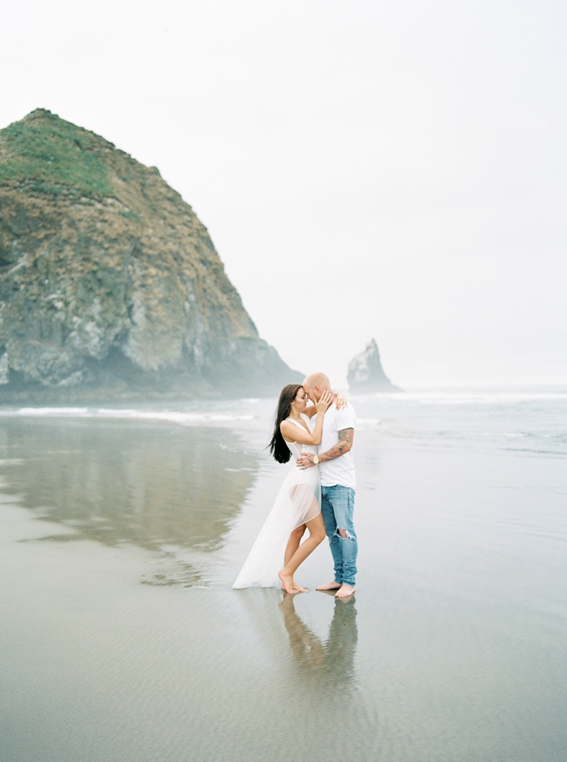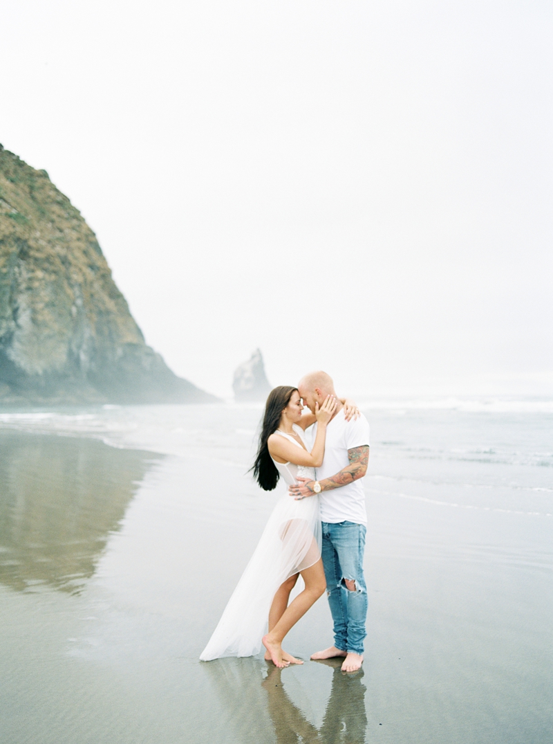 A few weeks ago I got to share Aireana and Josh’s gorgeous New Year’s Eve wedding with you at The White Sparrow Barn in Texas. Today I want to show you their stunning destination engagement photos at Cannon Beach along the picturesque Oregon Coastline. Aireana’s green dress chosen for this occasion was absolutely striking against the breathtaking scenery! The weather was cool and crisp as the fog rolled in off of the ocean and surrounded us. The couple loved how these photos showcased the magnificent beauty of the Pacific Northwest. They chose to have their engagement session photographed in Oregon because Josh owns a ranch there and they wanted to have a piece of this special place with them on their wedding day.