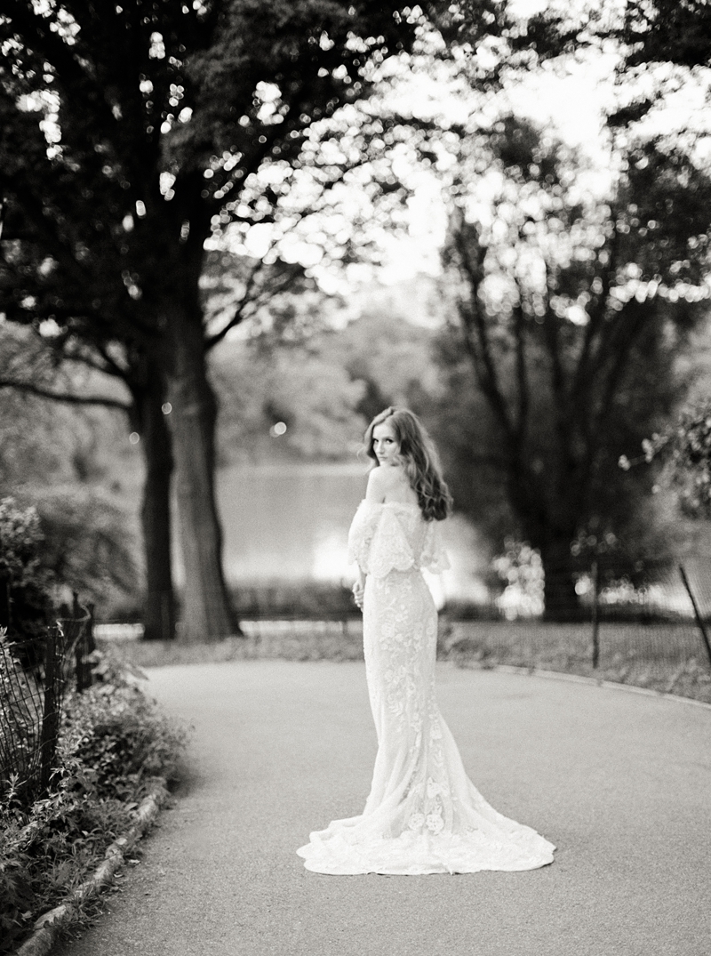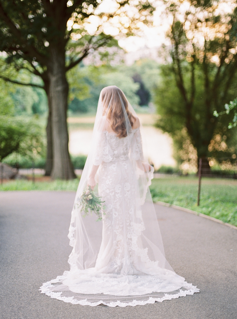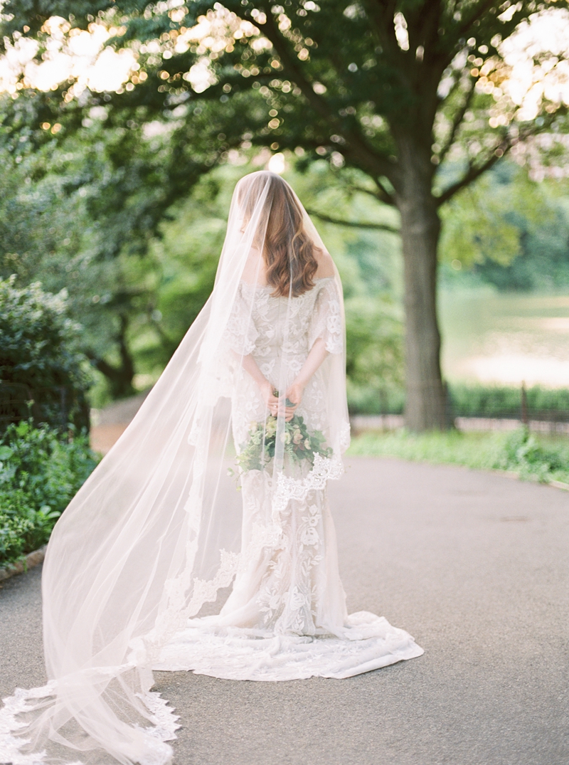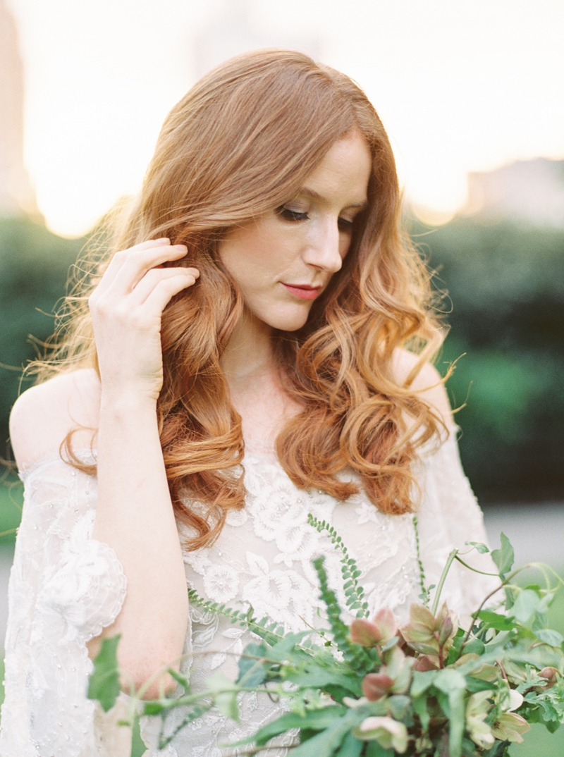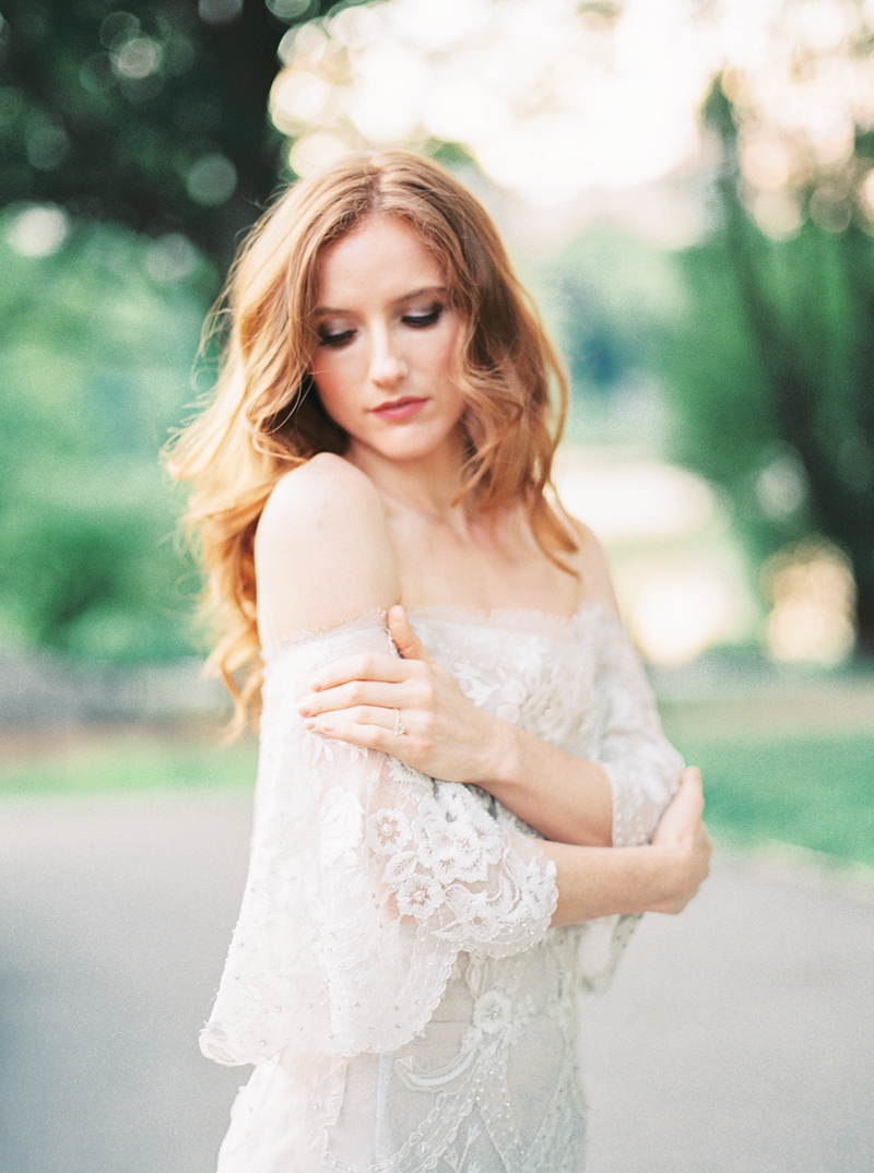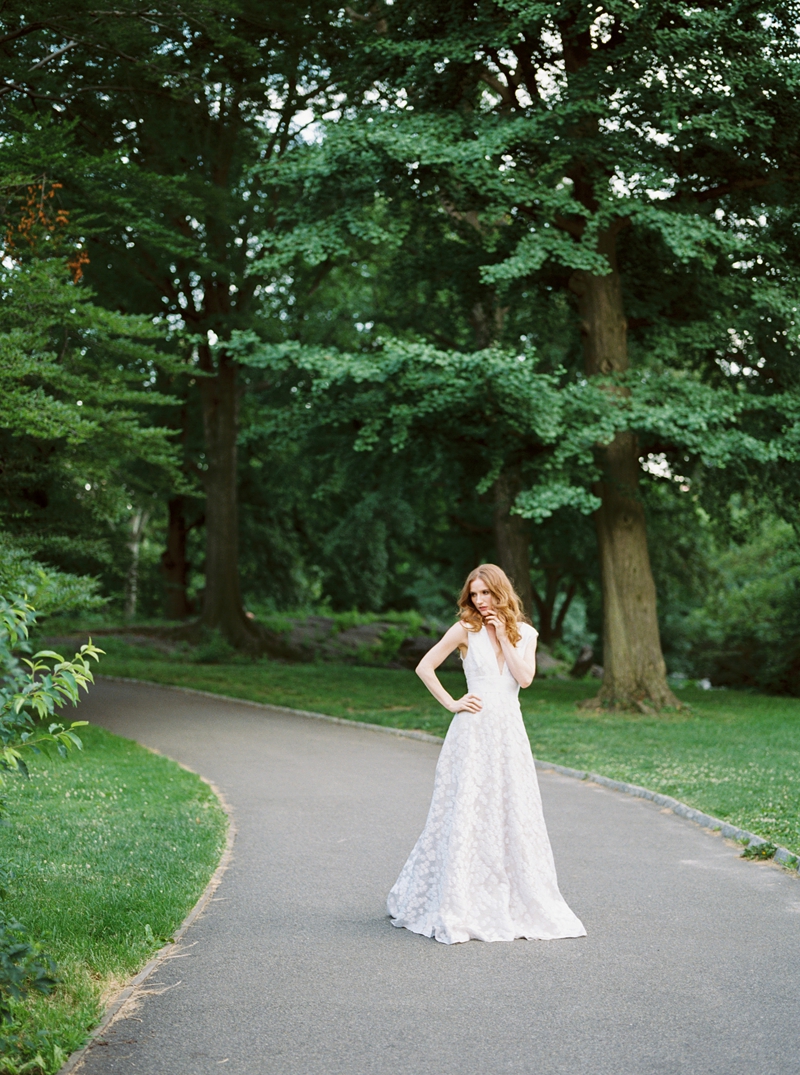 I always love to visit New York City! The sights, the sounds, the feeling of being in a city so full of life. I also love the peace of strolling down the winding paths of Central Park and getting lost in one of its many gardens. This bridal inspiration shoot was dreamed up by myself and the lovely event designer, Ambra of Query Events. Our inspiration was this stunning Marchesa gown. As soon as we spotted this gem tucked away in a sea of beautiful lace at Gabriella’s Bridal Boutique, we knew we had to have it! Shooting in Central Park was the perfect location for the elegant yet effortless gown. We paired our first look with a lace trimmed dropped veil by Blanca Veils which added to the allure of the overall concept. Styling our gorgeous model was an absolute breeze using only a Susie Saltzman gold set solitaire ring and her tousled fiery red hair. Query Events also provided a loose, gathered bouquet in elements found at the local floral district. I feel so lucky to have been a part of this beautiful day and all of the talented designers that made it come to life!