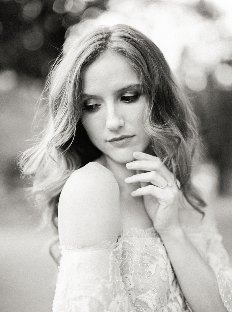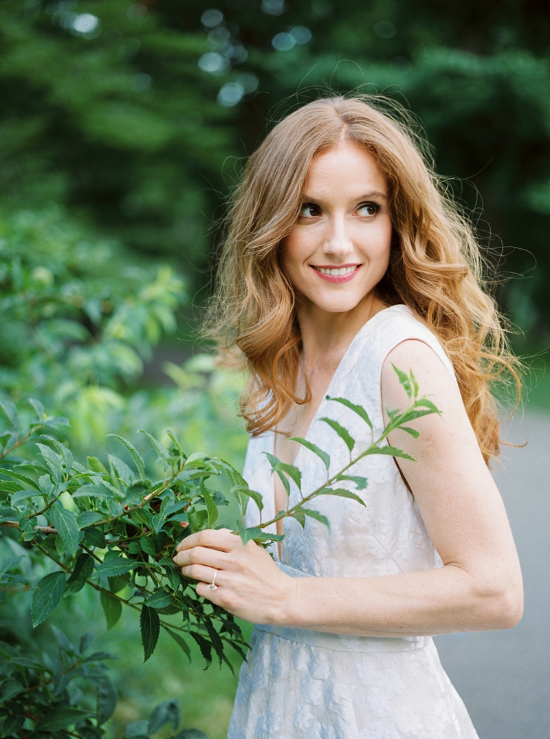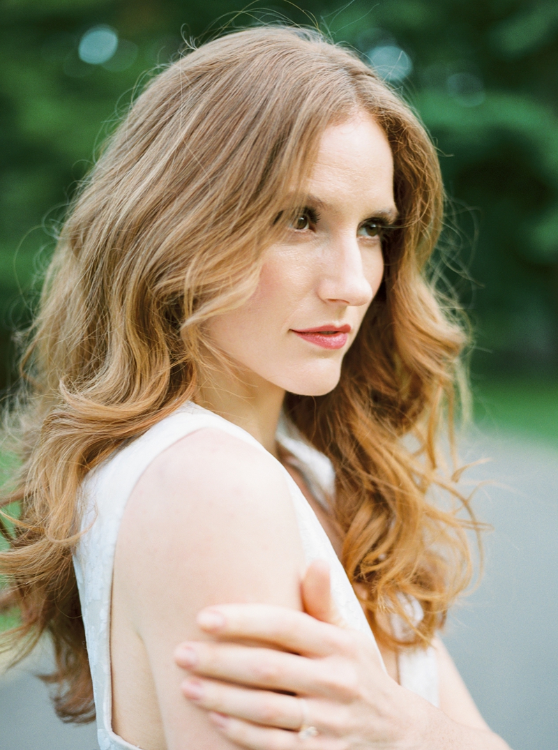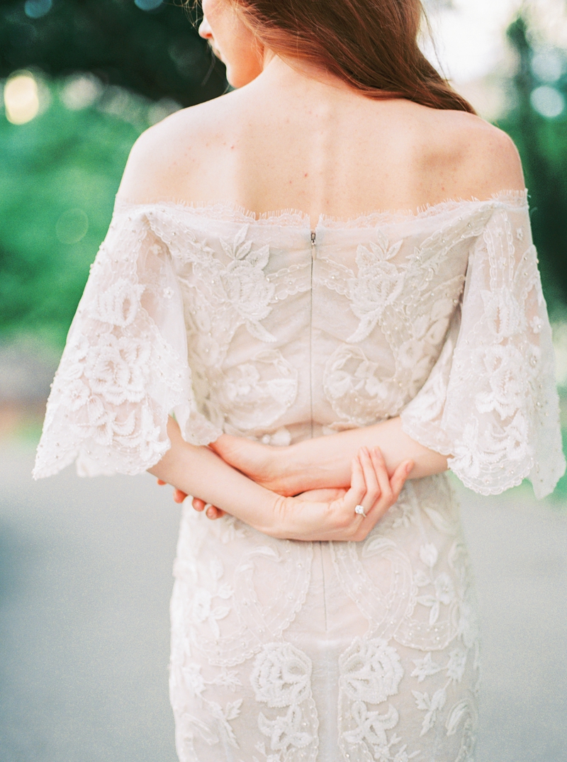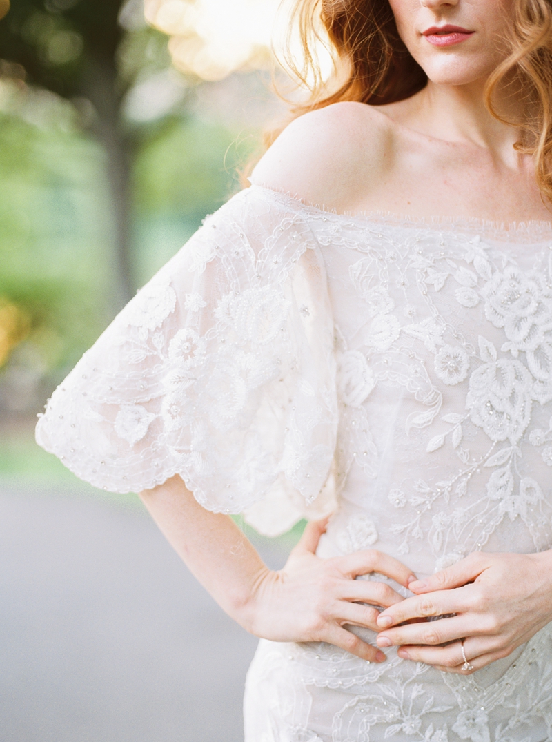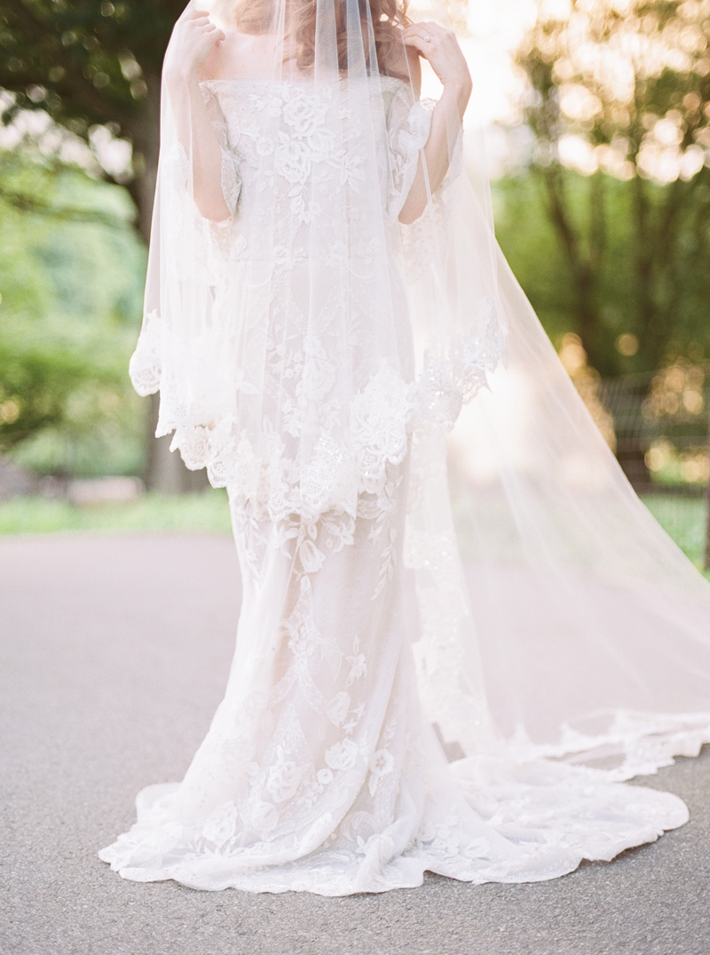 I always love to visit New York City! The sights, the sounds, the feeling of being in a city so full of life. I also love the peace of strolling down the winding paths of Central Park and getting lost in one of its many gardens. This bridal inspiration shoot was dreamed up by myself and the lovely event designer, Ambra of Query Events. Our inspiration was this stunning Marchesa gown. As soon as we spotted this gem tucked away in a sea of beautiful lace at Gabriella’s Bridal Boutique, we knew we had to have it! Shooting in Central Park was the perfect location for the elegant yet effortless gown. We paired our first look with a lace trimmed dropped veil by Blanca Veils which added to the allure of the overall concept. Styling our gorgeous model was an absolute breeze using only a Susie Saltzman gold set solitaire ring and her tousled fiery red hair. Query Events also provided a loose, gathered bouquet in elements found at the local floral district. I feel so lucky to have been a part of this beautiful day and all of the talented designers that made it come to life!