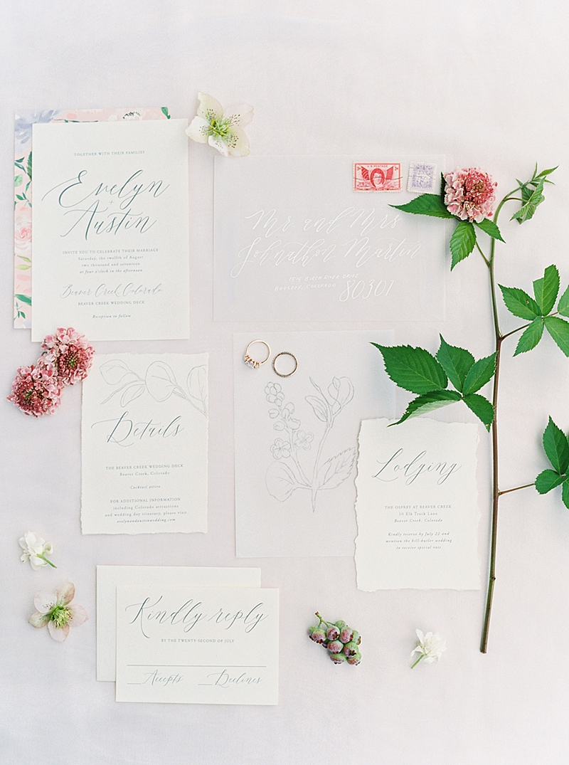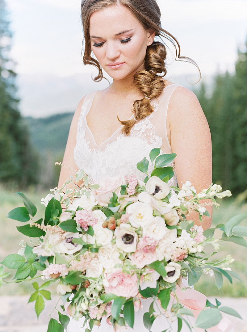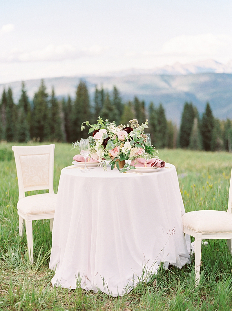 High in the stunning mountains of Colorado, Beaver Creek is a wedding dream come true! This beautiful venue has the cozy, relaxed feel of an Alpine Village with sun-bathed aspen groves and fields of summer flowers that evoke romance in the mountain air. We were so excited to see the Wedding Deck in person and enjoy the awe-inspiring views from the top! The natural, lovely details added to the feminine and effortless feeling of this shoot that my team and I had a wonderful time putting together.