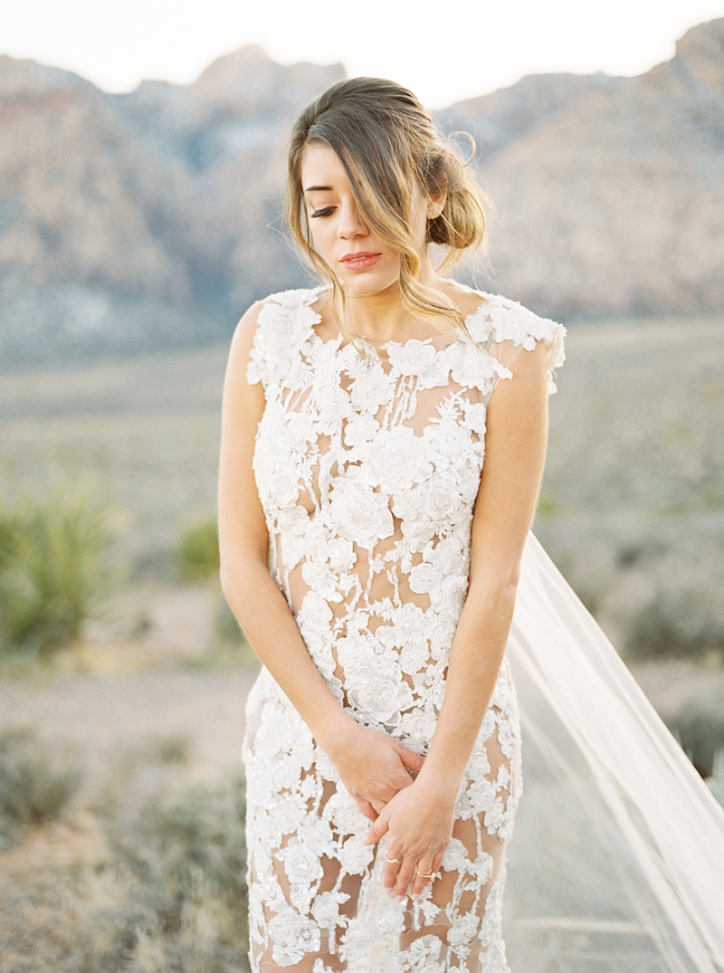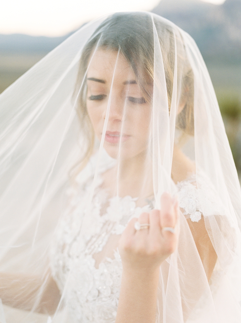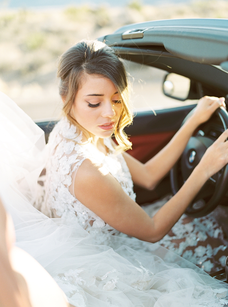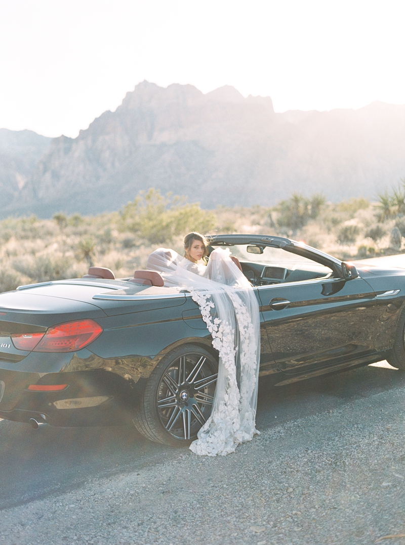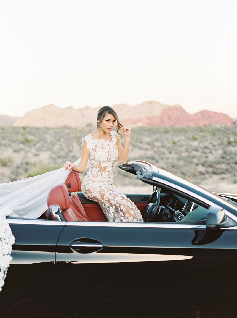 The aesthetic for this shoot was both soft and sultry. The day started out with the feeling of a boudoir session, but with elements of grace and sentimentality. We kept a fairly neutral color scheme, playing off of the colors of the desert surroundings, but in more muted tones. I love how the austere landscape contrasts to the delicacy of the flowers in her bouquet. The gown in particular was a show stopper! The sheer lace was both sexy and elegant, and the long, flowy veil gave our bride’s whole look a dreamy quality. Also, how cool is that car?! The sleek, black body with red leather seats and miles of open road in front of you? Sign me up! Then draping it in the lace of that gorgeous veil completely changes the look and suddenly makes it feel romantic. My team and I had so much fun coming up with something really different to inspire brides who may be slightly non-traditional. I hoped to show them that they can have dreamy elegance and a sultry feel all in the same day to make their wedding a true reflection of them.