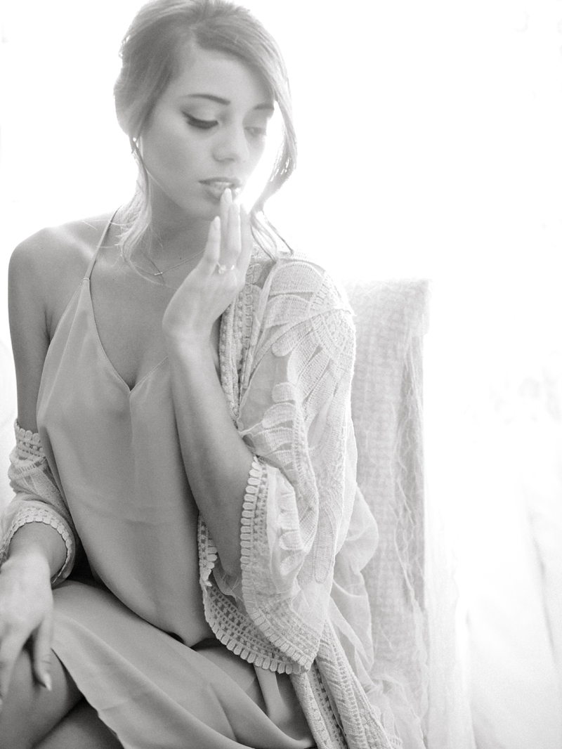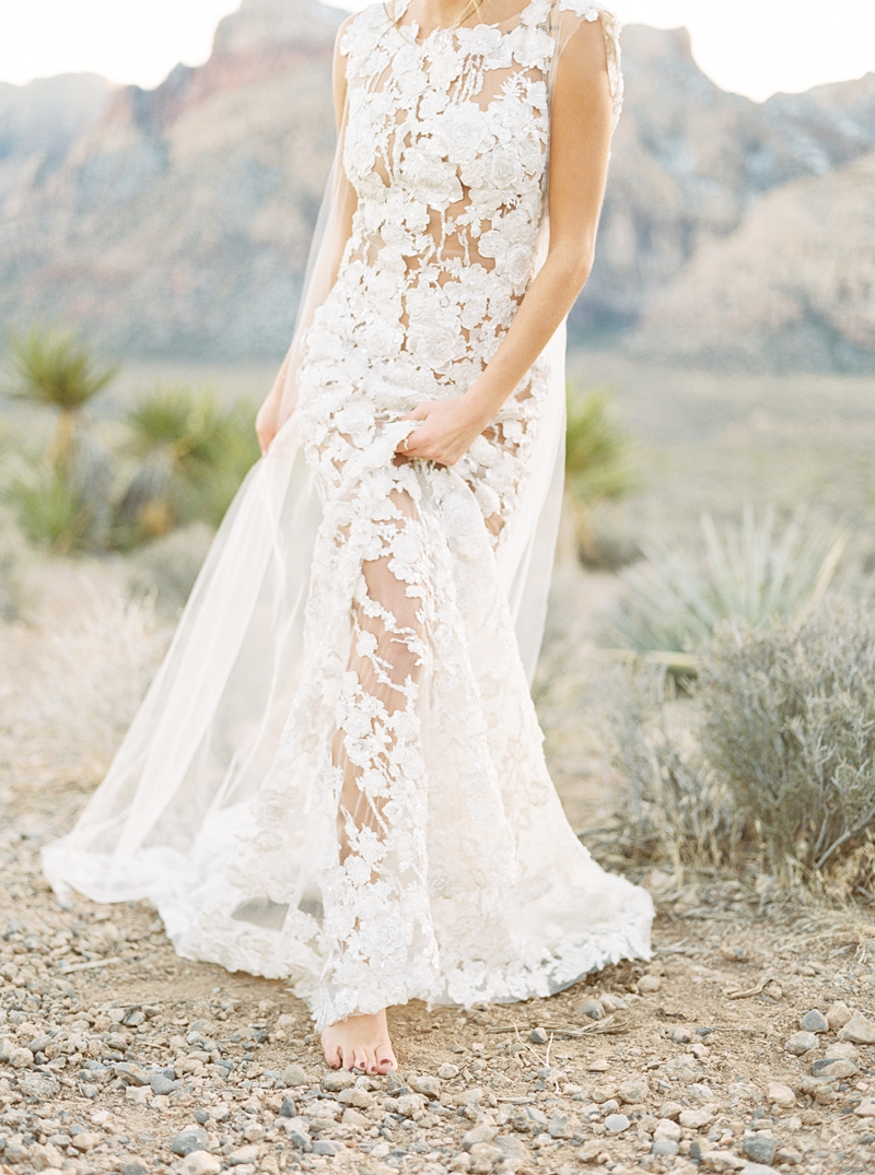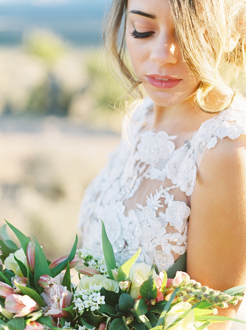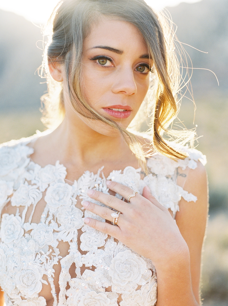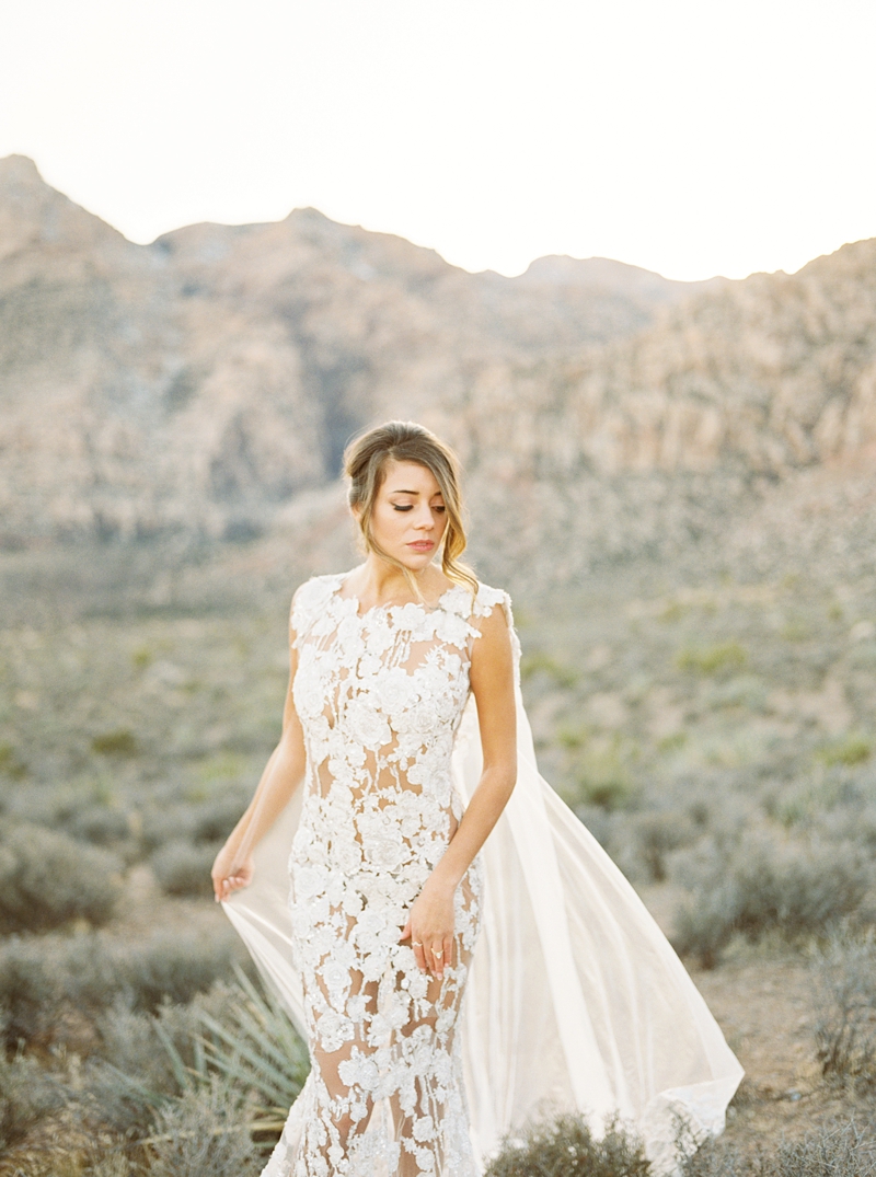 The aesthetic for this shoot was both soft and sultry. The day started out with the feeling of a boudoir session, but with elements of grace and sentimentality. We kept a fairly neutral color scheme, playing off of the colors of the desert surroundings, but in more muted tones. I love how the austere landscape contrasts to the delicacy of the flowers in her bouquet. The gown in particular was a show stopper! The sheer lace was both sexy and elegant, and the long, flowy veil gave our bride’s whole look a dreamy quality. Also, how cool is that car?! The sleek, black body with red leather seats and miles of open road in front of you? Sign me up! Then draping it in the lace of that gorgeous veil completely changes the look and suddenly makes it feel romantic. My team and I had so much fun coming up with something really different to inspire brides who may be slightly non-traditional. I hoped to show them that they can have dreamy elegance and a sultry feel all in the same day to make their wedding a true reflection of them.