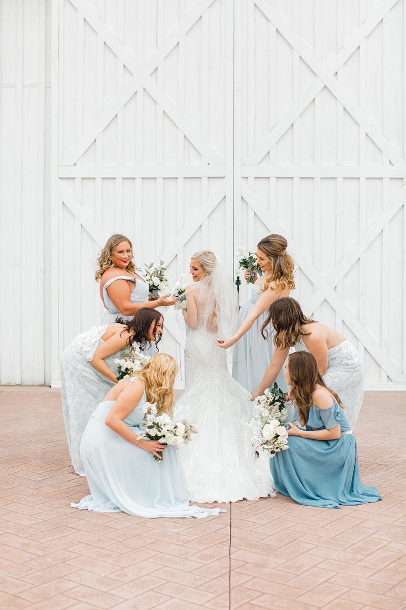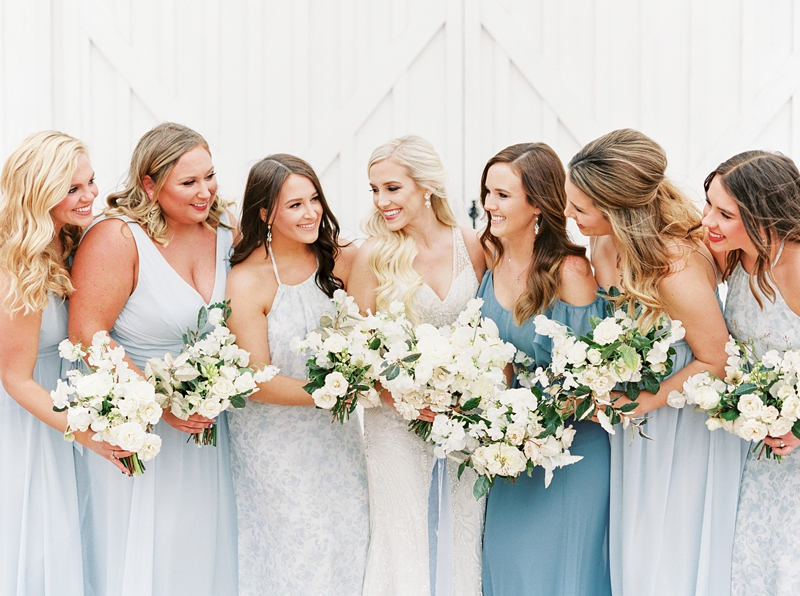 Bride and bridesmaids in front of gazebo, Southern mansion wedding, blue bridesmaid dresses